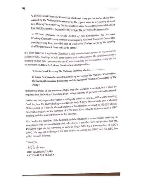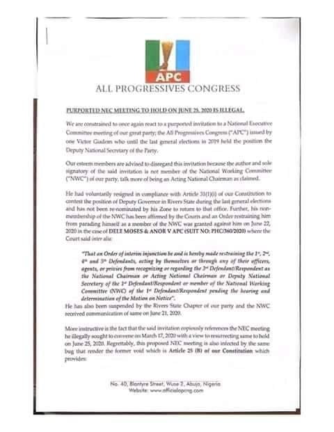 “More instructive is the fact that the said invitation copiously references the NEC meeting he illegally sought to convene on March 17, 2020 with a view to resurrecting same to hold on June 25, 2020. Regrettably, this proposed NEC meeting is also infected by the same bug that render the former void which is Article 25 (B) of our constitution which provides: