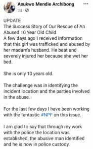 “The Success Story of Our Rescue of An Abused 10 Year Old Child. A few days ago I received information that this girl was trafficked and abused by her madam’s husband. He beat and severely injured her because she wet her bed.
