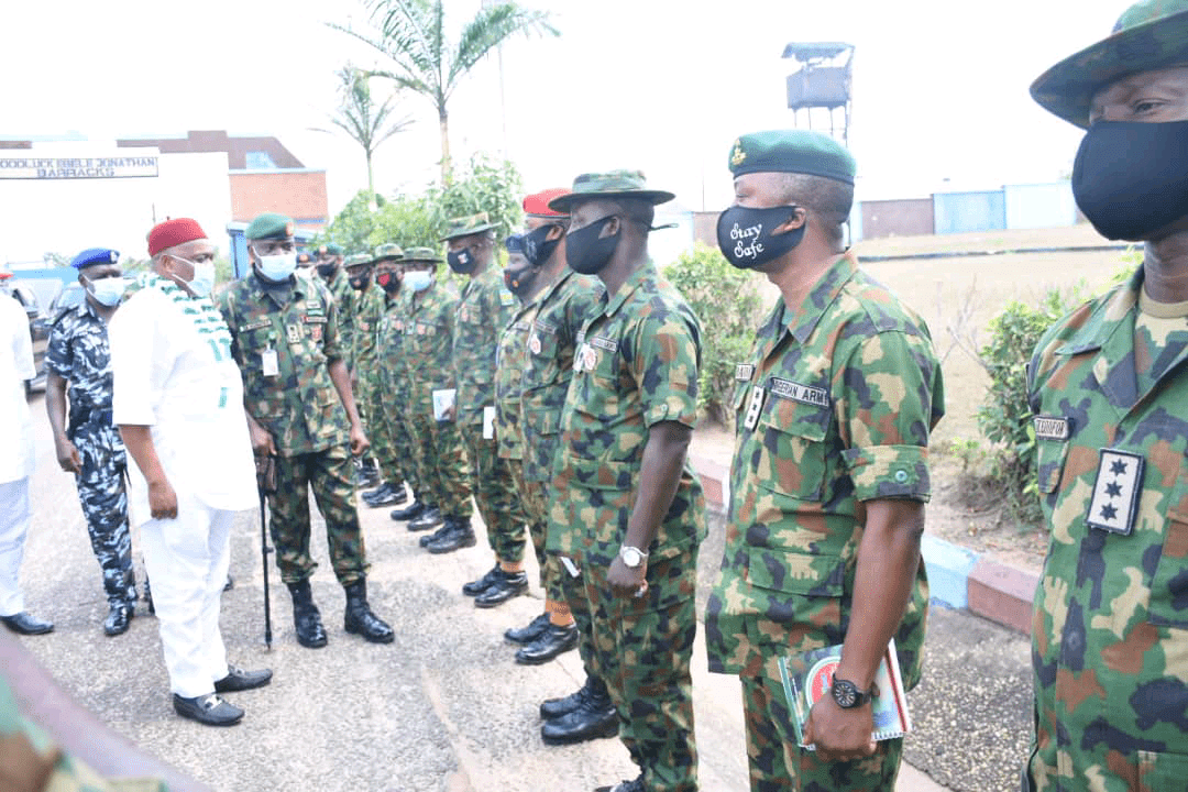 The 14 Brigade Headquarters of Nigerian Army, Ohafia, Abia State is currently playing host to the Chief Whip of the Senate and former Governor of Abia State, Senator Orji Uzor Kalu.