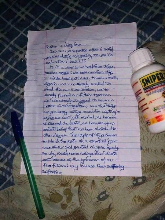 Two lovers from Okija, Anambra State drank poison (Snipper) because their parents refused to give their consent to get married to each other all because of Osu And Ohu Caste palava.