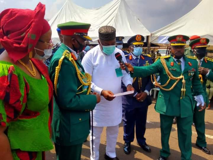 Gov. Ugwuanyi who handed over a cheque of N5 million to the General Officer Commanding (GOC) of the 82 Division of the Nigerian Army, Maj. Gen. Lasisi Adegboye, for onward distribution to the widows, at a brief ceremony held at the Parade Ground, Abakpa Cantonment, Enugu, also made symbolic presentations of the food items to selected wives of the fallen heroes.