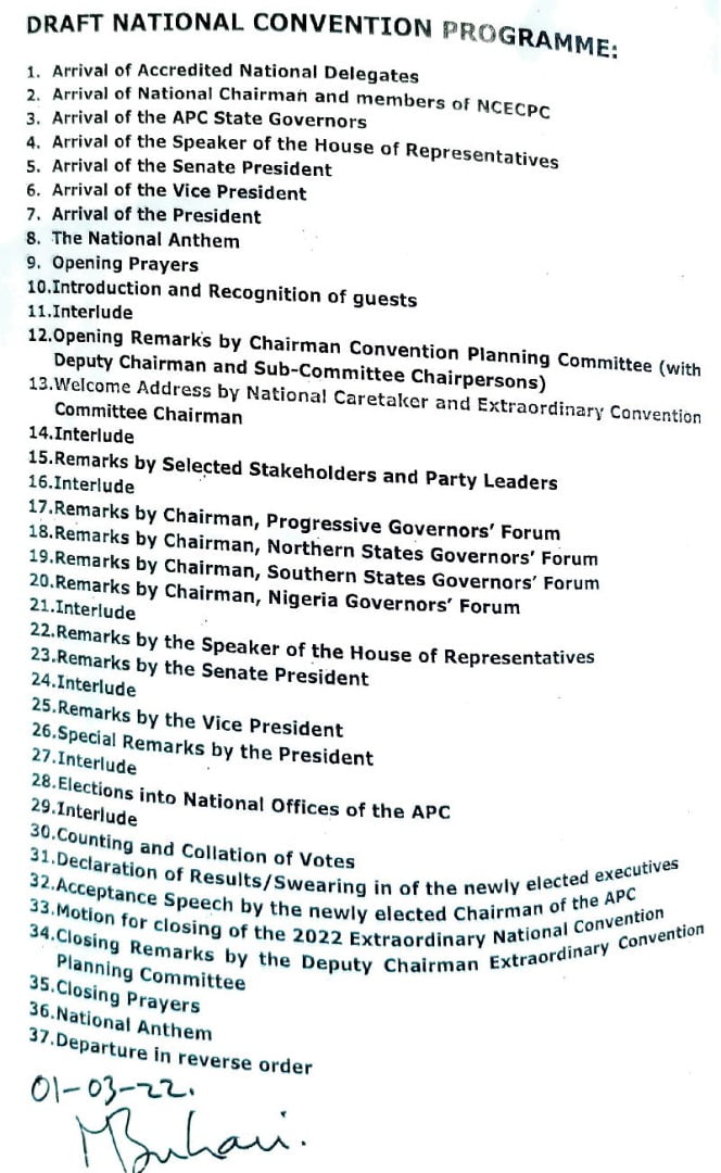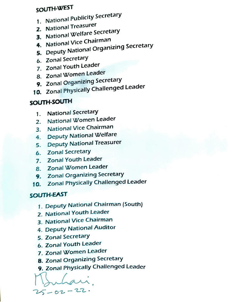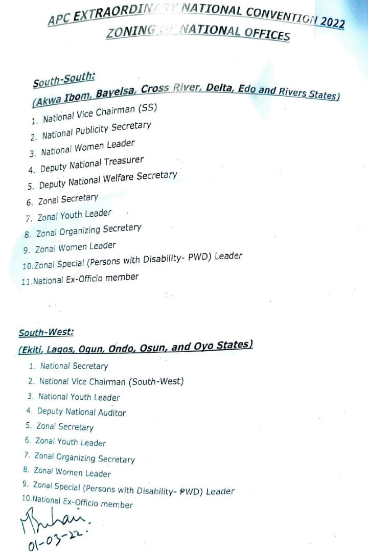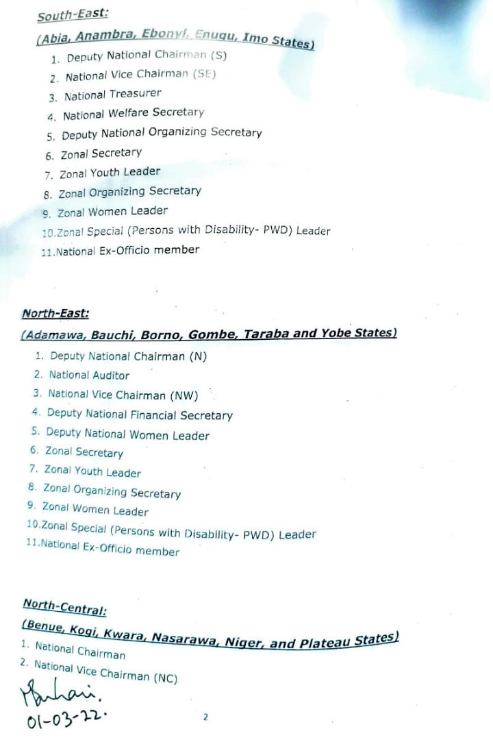 The documents show that the president has signed off on Senator Abdullahi Adamu as National Chairman, Senator John Akpanudoedehe from the south-south geopolitical zone as National Secretary, and Senator Ken Nnamani from the south-east as Deputy National Chairman (South). The president also signed off on other positions that have been pinned down to geopolitical zones.