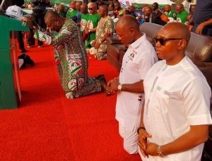 At the successful rally which witnessed the reception of huge number of members of the All Progressives Congress (APC) in Enugu West Senatorial District led by former acting Chairman of the APC in Enugu State and former Deputy Governorship candidate of the APC in 2019 general election, Prince Gilbert Chikwado Chukwu, who decamped to the PDP, Governor Ugwuanyi went down on his knees with other party stalwarts after he asked the state Chairman of Christian Association of Nigeria (CAN), Rev. Amb. Emmanuel Edeh to pray for the Senator representing the district in the National Assembly, Prof. Ike Ekweremadu and his family over their ordeals in the United Kingdom.