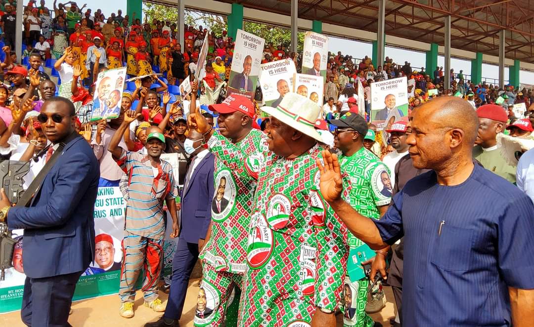 In their solidarity speeches, the Secretary of the Planning Committee and lawmaker, representing Nsukka/Igbo-Eze South Federal Constituency, Rt. Hon. Dr. Pat Asadu; the lawmaker, representing Igbo-Etiti/Uzo-Uwani Federal Constituency and PDP candidate, Rt. Hon. Dr. Martins Oke, accompanied by PDP candidates for Nsukka/Igbo-Eze South and Igbo-Eze North/Udenu federal constituencies, Engr. Vita Abba and Engr. Simon Atigwe respectively; the lawmakers representing Igbo-Etiti East and Nsukka East constituencies, Rt. Hon. Ezenta Ezeani and Rt. Hon. Dr. Chinedu Nwamba respectively; Chairman of the Association of Local Government of Nigeria (ALGON), Enugu State Chapter, Hon. Solomon Onah, explained that the Enugu North Senatorial District mega endorsement rally was a reaffirmation of the earlier declaration by the people of Nsukka zone in 2021 in support of Governor Ugwuanyi and the PDP, the governor’s choice of successor and his political decisions in respect of the 2023 general election.