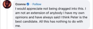 Anambra state Governor Chukwuma Charles Soludo First Son Ozonna Soludo has dissociated himself from his father attack on the person of Peter Obi .