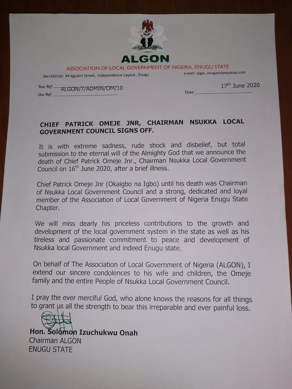 The Association of Local Governments of Nigeria (ALGON), Enugu State Chapter, has announced with “extreme sadness, rude shock and disbelief,” the death of Chief Patrick Omeje Jnr., who until his demise, was the Chairman of Nsukka Local Government Area.