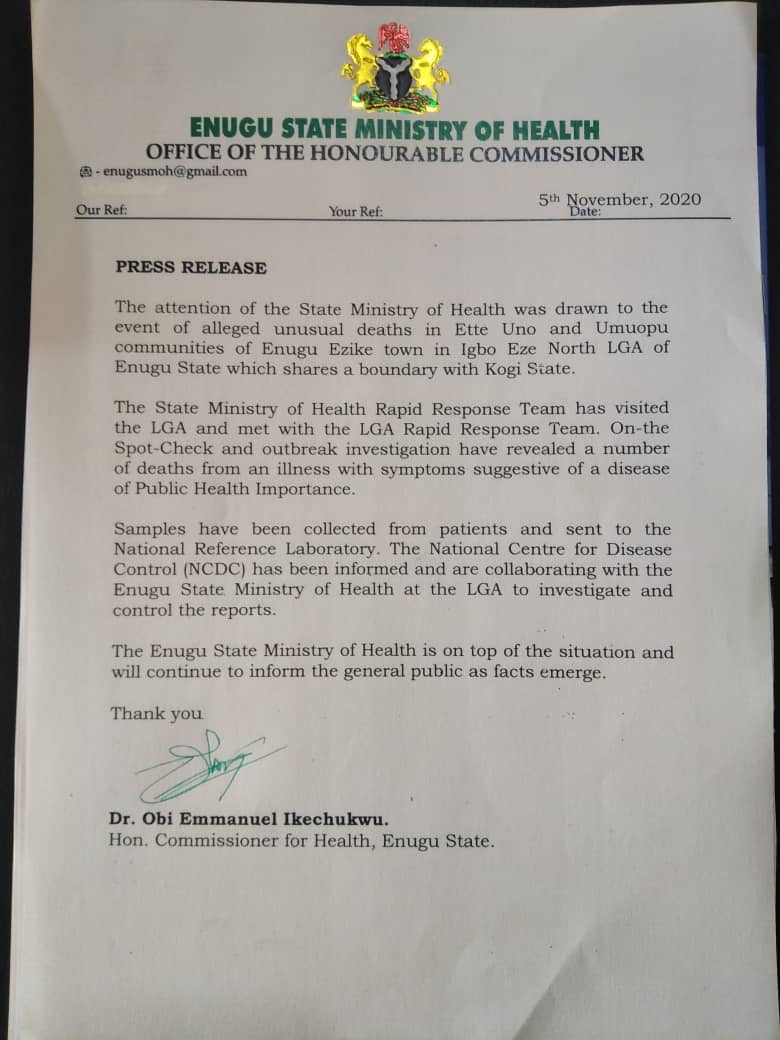 A statement by the State Commissioner for Health, Dr. Emmanuel Ikechukwu Obi, added that the State Rapid Response Team of the Ministry visited Igbo-Eze North LGA and met with the LGA Rapid Response Team, disclosing that “on-the-spot-check and outbreak investigation have revealed a number of deaths from an illness with symptoms suggestive of a disease of Public Health Importance”.