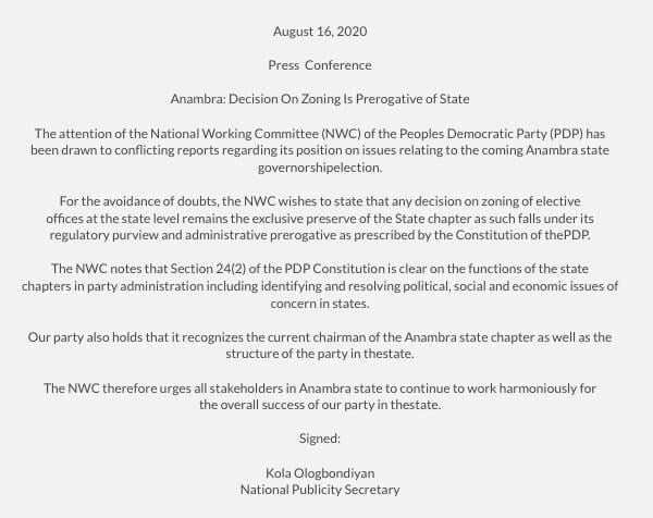 The attention of the National Working Committee (NWC) of the Peoples Democratic Party (PDP) has been drawn to conflicting reports regarding its position on issues relating to the coming Anambra state governorship election.