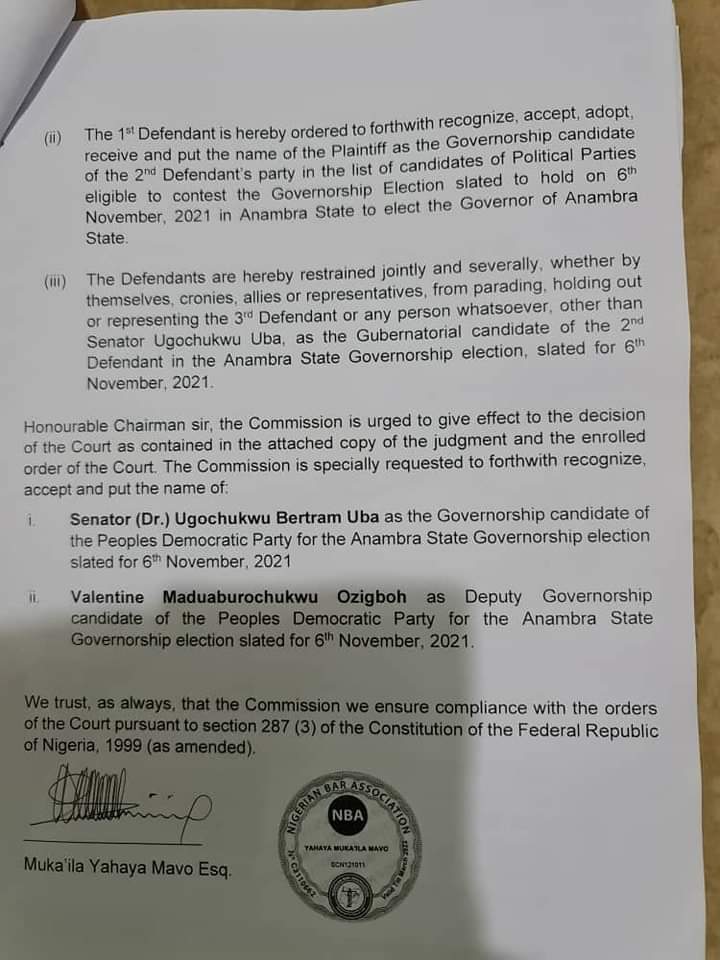 Last night, the news came in that the name of Senator Ugochukwu Uba has been submitted to INEC alongside the copy of the judgement of Justice Obiorah Nwabunike of the Anambra state high Awka.