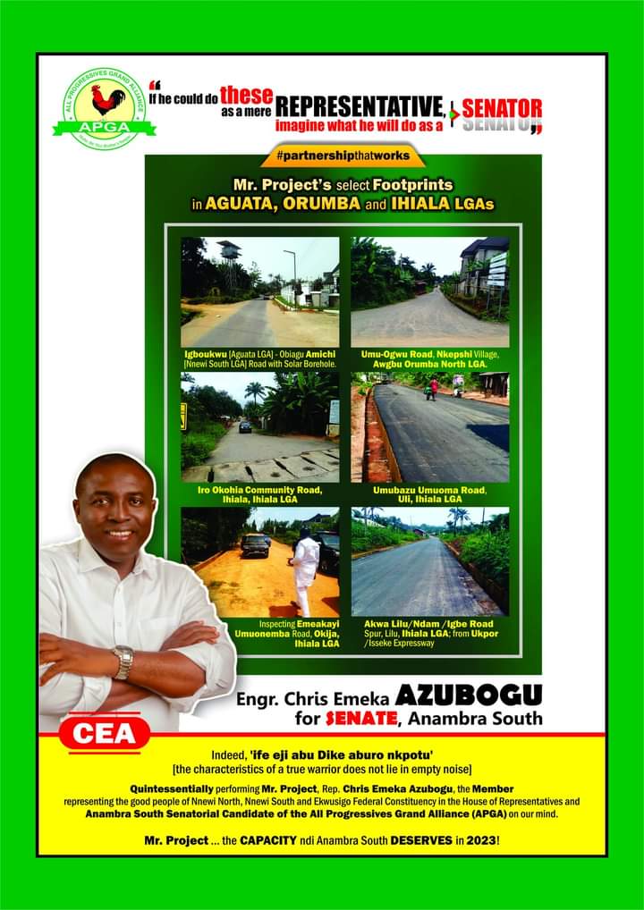 And by the special grace of God, that Senator shall be none other than QUINTESSENTIALLY performing Rep. Chris Emeka Azubogu whose ANTECEDENT, as a mere Rep, not only inspires AWE but has guaranteed the extension of KEY projects to ALL seven LGAs in the South zone ~ even when he isn’t representing as many as four of the seven (7) councils.