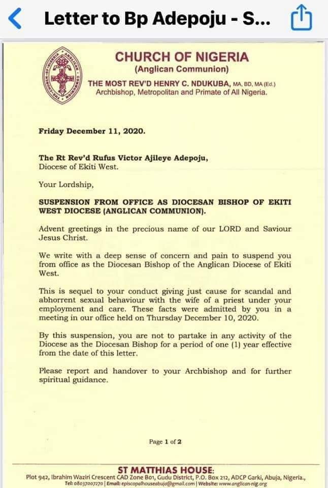 The priest whose wife Mr. Adepoju allegedly had affairs with and the woman were not named in the suspension letter, which has been in circulation on social media since Tuesday afternoon.