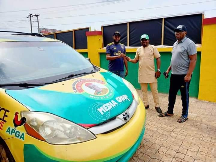 Hon Chukwuma Umeoji the APGA governorship aspirant for November 6 election gave a sienna car to Uloka Chuks OyePikin yesterday.