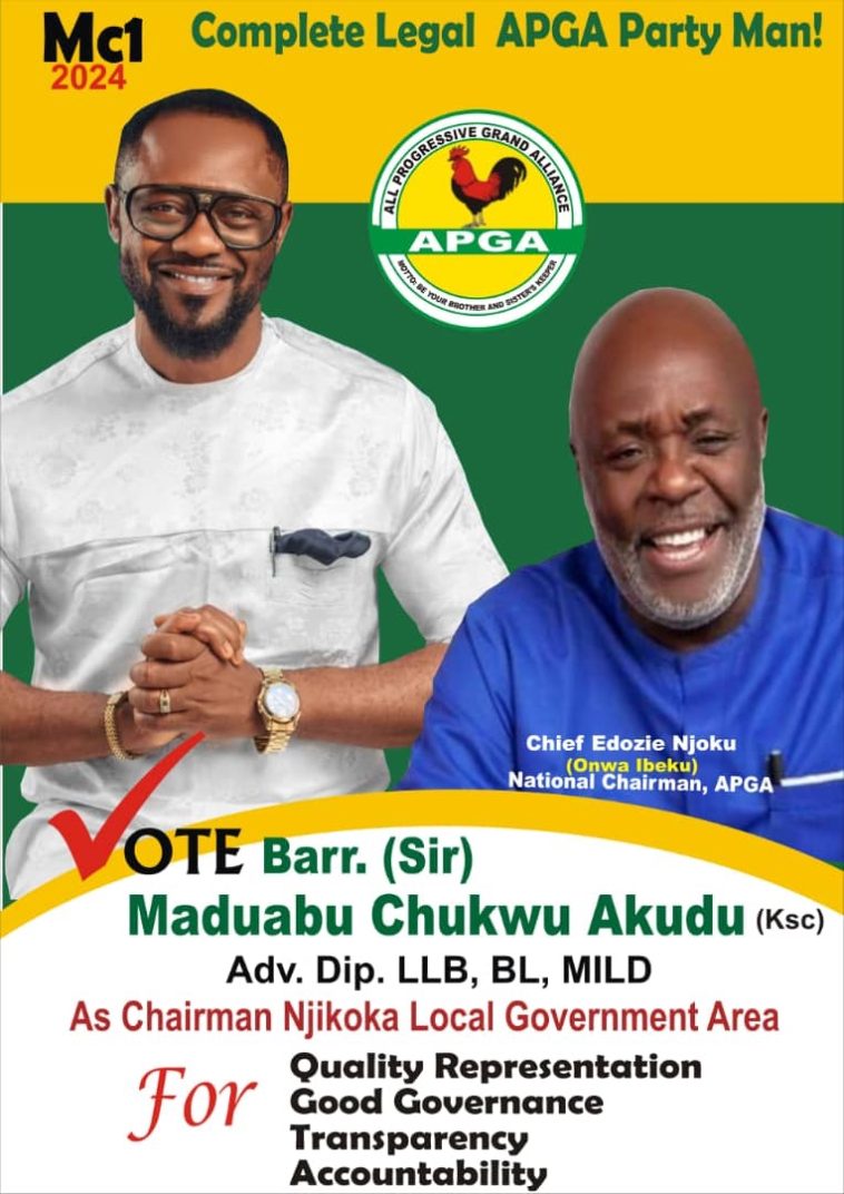 Abagana, Anambra State – Barrister (Sir) Maduabu Chukwu Akudu (Ksc), an aspirant for the Chairmanship of Njikoka Local Government Area under the All Progressives Grand Alliance (APGA), has presented his detailed manifesto to the people of Njikoka. A legal practitioner and businessman from Abagana, Barr. Akudu outlined his commitment to unity, prosperity, and peace for the local government area.