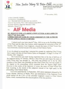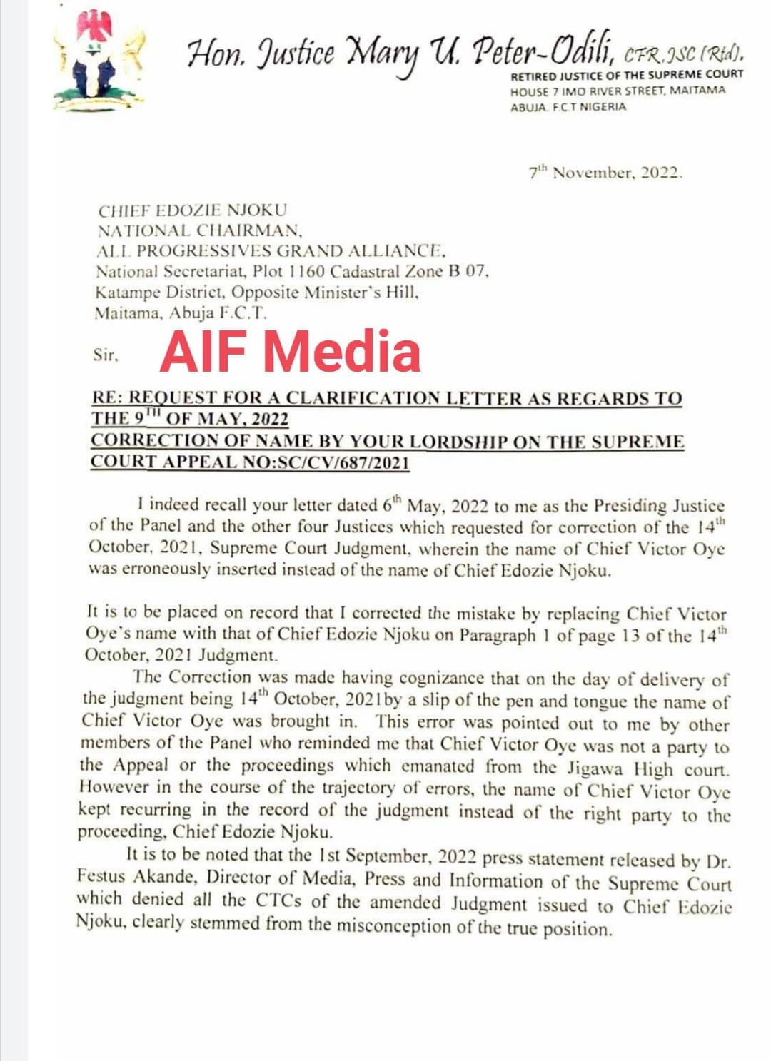 Justice Mary Odili who is the chairman of the 5 man panel that delivered judgement on October 14, 2021, in a letter dated November 7, 2021, stated that Victor Oye was not a party to the suit and that even in the letter from the Director of Media of the Supreme court, Mr Festus Akande, which denied all the CTCs issued by the Supreme court on that matter was as a result of the misconception and not the true position of the amended judgement of October 14, 2021.