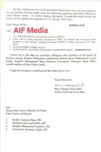 In conspiracy with INEC, Oye concocted a letter purportedly from the Director of Media, Supreme court which complicated the matter but INEC quickly acted on that useless letter and continued to deal with Oye.