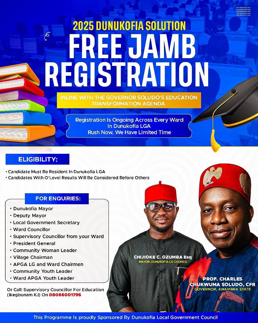 • Registered and enrolled 850 Dunukofia indigent resident candidates for 2025 JAMB examinations.