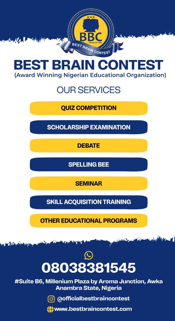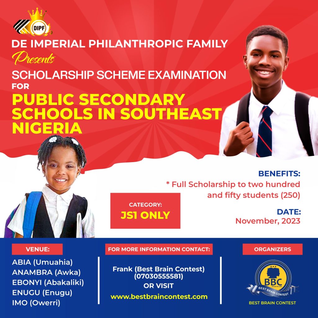 Under this contract, Best Brain Contest is set to conduct scholarship examinations for Public Secondary School Students in the Five States that make up the South East of Nigeria, And select 250 beneficiaries (50 from each state in the South East). These students will be selected to benefit from De Imperial Philanthropic Family scholarship scheme. The exams will be held in the state capitals of Awka (Anambra), Enugu (Enugu State), Abakaliki (Ebonyi), Umuahia (Abia), and Owerri (Imo).