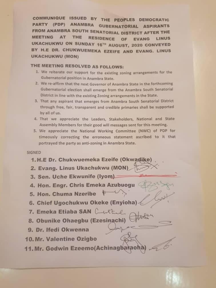 All the PDP governorship aspirants from Anambra south senatorial zone met this night at the home of Evang Linus Ukachukwu where the decision to insist on Zoning to south was reached.