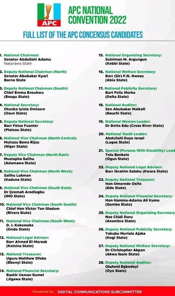 “May I kindly refer to the appeal by President Muhammad Buhari for the chairmanship aspirants of our great party to agree to a consensus arrangement wherein our colleague Sen. Abdullahi Adamu is made our consensus candidate for the chairmanship position.”