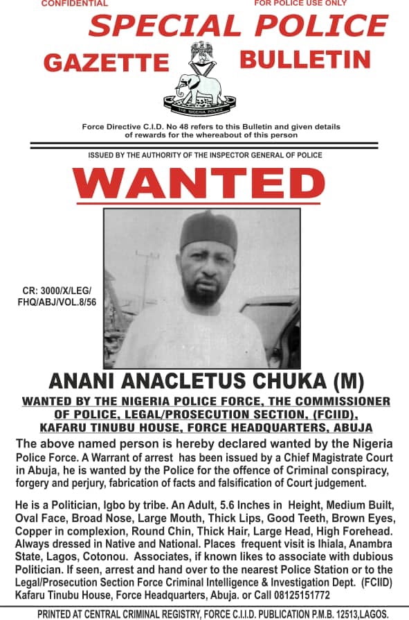 They arel wanted in relation to offences bordering on criminal conspiracy, forgery and perjury, falsification of facts and falsification of court judgement to clandestinely remove Senator Ifeanyi Ubah from office as the Senator representing Anambra South in the Ninth National Assembly.