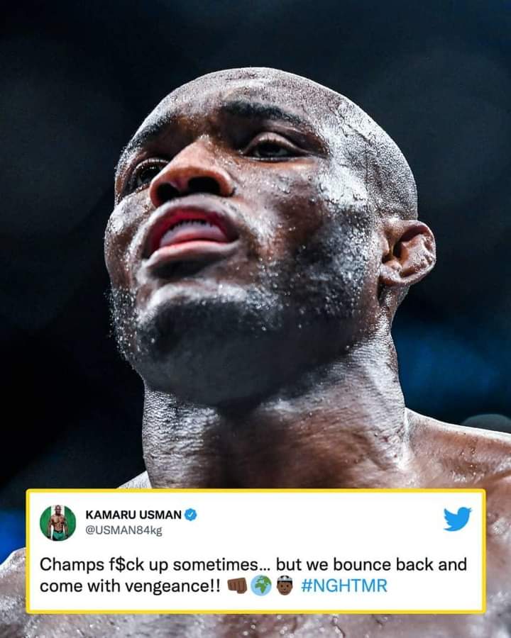 Moments after the fight ended, Usman tweeted, “Champs f$ck up sometimes…but we bounce back and come with vengeance!! 👊🏿🌍🤴🏿 #NGHTMR”