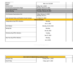 The Veritas University, Abuja, calendar of academic activities for regular programmes (100,200,300,400 Levels) for the 2022/2023 academic session.
