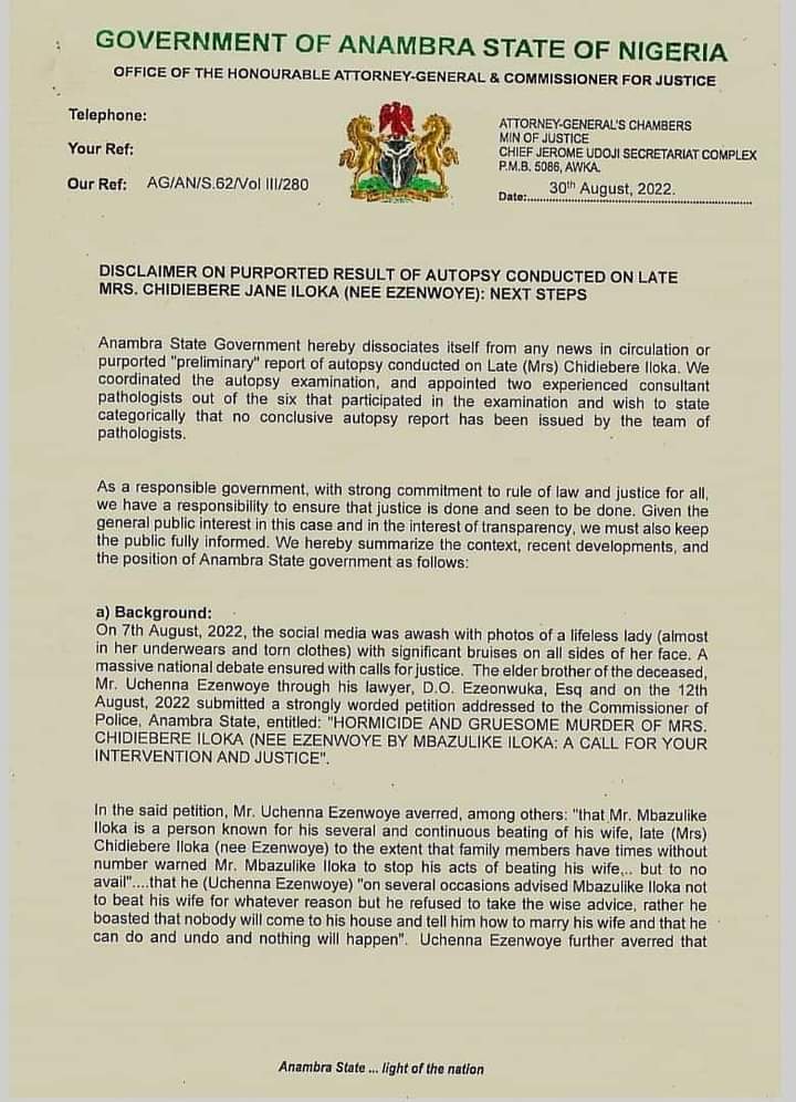 Anambra State Government has dissociated itself from any news in circulation or purported “Preliminary” report of autopsy conducted on late (Mrs) Chidiebere Iloka