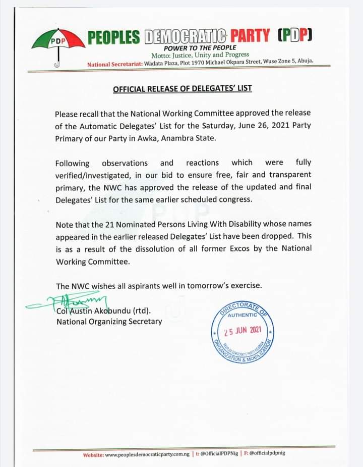 Two delegate lists within 24 hours is not good for PDP in an election scheduled to hold tomorrow at Awka.