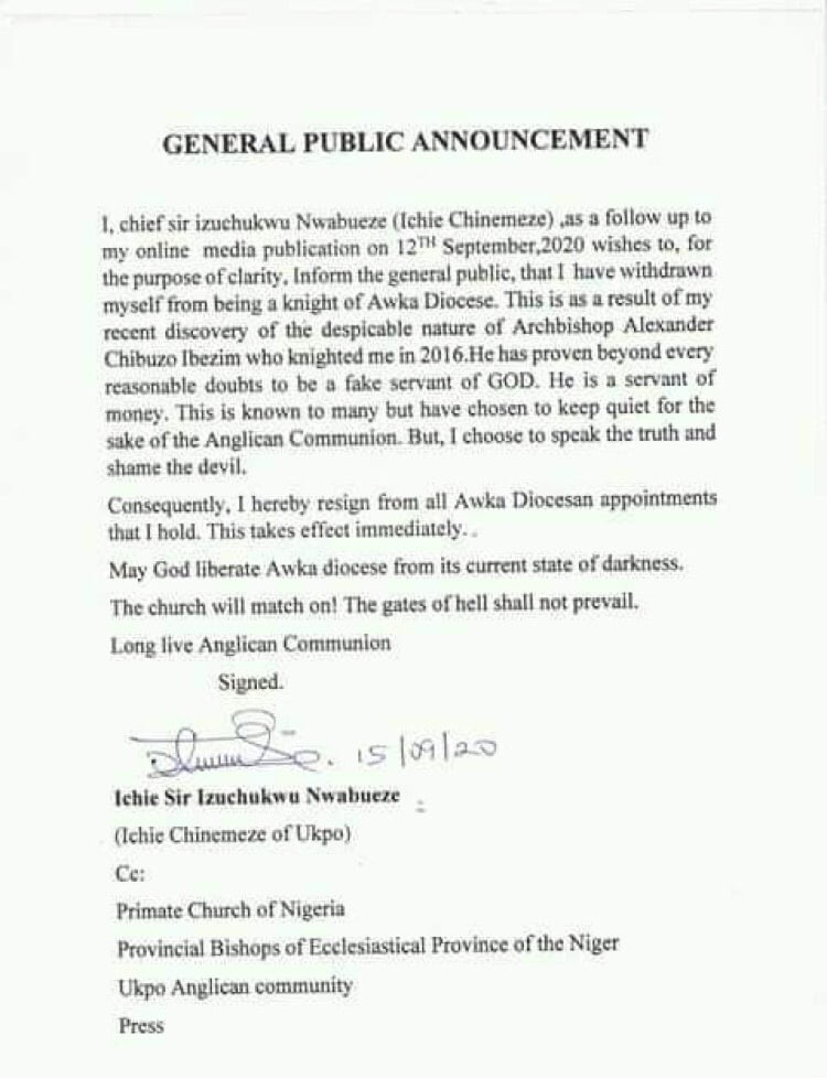 ‘You Are A Fake Man Of God Who Worships Only Money” – Anglican Knight Blasts Bishop Ibezim Of Awka Diocese Before Resigning From The Knighthood.