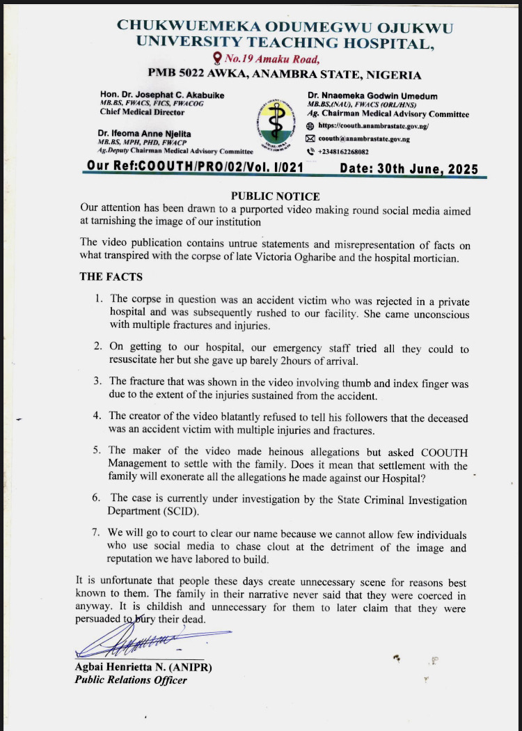 The management of Chukwuemeka Odumegwu Ojukwu University Teaching Hospital (COOUTH), Awka, Anambra State, has issued a public notice debunking claims made in a viral video circulating on social media concerning the treatment of the late Victoria Ogharibe.