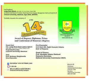Crescent University, Abeokuta, CUAB 14th convocation ceremony date, time and venue for the award of Degree, Diploma, Prizes and conferment of Honorary Degrees.