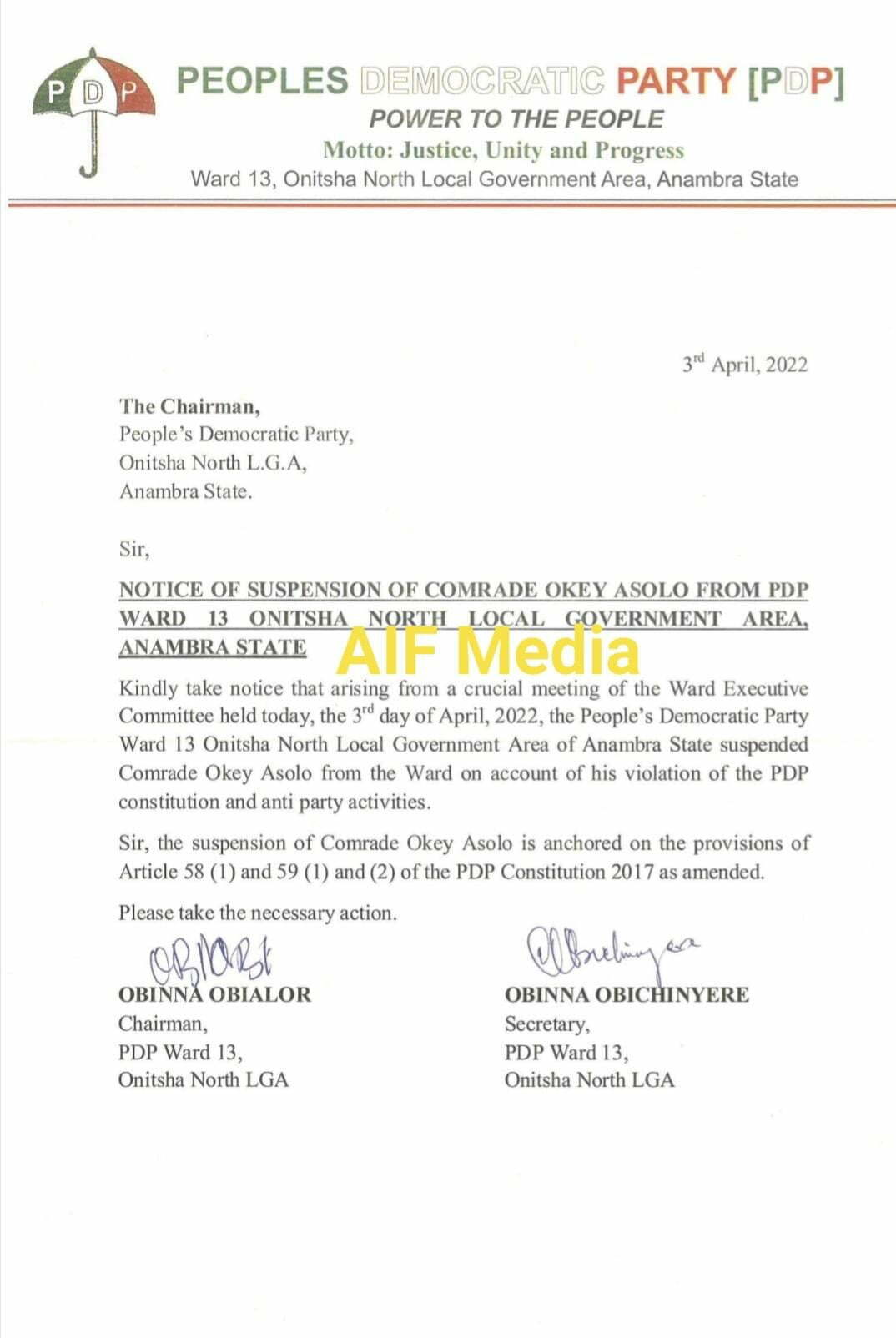 In a letter sent to AIF Media, the PDP ward 13 Onitsha north LGA said “arising from a crucial meeting from the ward executive committee held today, the 3rd day of April 2022, the People’s Democratic Party ward 13, Onitsha north local government area of Anambra state suspended Comrade Okey Asolo from the ward on account of violation of PDP constitution and anti party activities.”