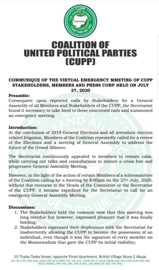 In line with our resolve to reposition and rebrand the Coalition of United Political Parties (CUPP) for the collective good of all Nigerians and the need to form a formidable force ahead of the 2023 elections, the CUPP held an extra-ordinary virtual General Assembly meeting on Monday, July 27, 2020.