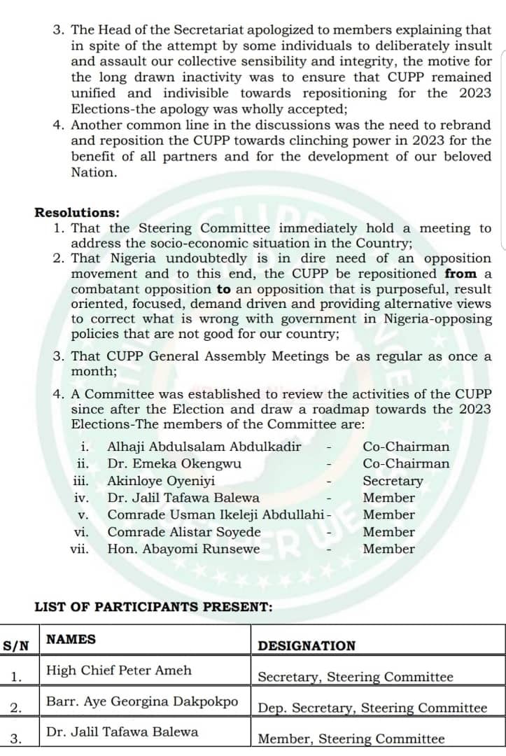Based on current political realities and the need to forge a formidable force for the good of our beloved country, CUPP also resolved to set up a committee to draw a roadmap towards the 2023 elections.