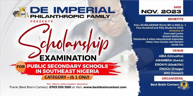 Best Brain Contest, renowned for its integrity and successful execution of scholarship examinations, quiz competitions, skill acquisition, and educational programs, has been contracted to organize scholarship exams exclusively for Junior Secondary School 1 (J.S.1) students across the South Eastern region. The exams will take place in each state capital – Awka for Anambra, Enugu for Enugu State, Abakaliki for Ebonyi, Umuahia for Abia, and Owerri for Imo. A total of 250 students, 50 from each state, will be selected and inducted into the De Imperial Philanthropic Family scholarship scheme.