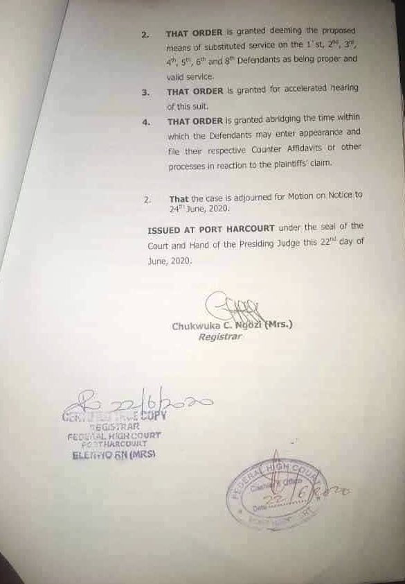 However, Hon. Justice E.A Obile, in the orders, also granted to the applicant an order for substituted means of Service on the 1, 2, 3, 4, 5, 6, 7 and 8 defendants by serving the Originating Summons and other Court Processes in this suit on the said Defendants through publication in two (2) National Dallies (Newspapers) Or by serving the Originating Processes and other Court Processes in this suit at the respect addresses at the various Defendants as reflected on the Originating Summons.