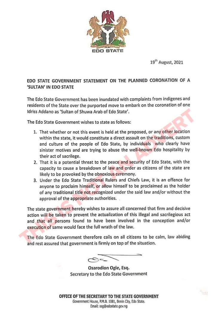 The statement reads: “The Edo State Government has been inundated with complaints from indigenes and residents of the state over the purported move to embark on the coronation of one Idriss Addano as ‘Sultan of Shuwa Arab of Edo State’.