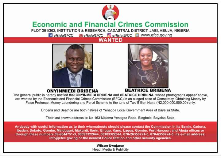 The Economic and Financial Crimes Commission (EFCC) has declared the Chief Executive Officer of Baraza Multipurpose Cooperative, a Bayelsa-based ponzi scheme, Pastor (Dr) Miebi Bribena (full name: Onyimiebi Bribena) and his wife, Beatrice Bribena wanted for allegedly defrauding Nigerians to the tune of N2 billion.
