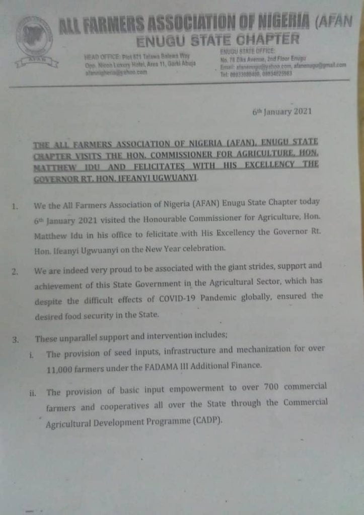 Speaking when they paid a courtesy visit to State Commissioner for Agriculture, Hon. Matthew Idu, to felicitate with Gov. Ugwuanyi on the New Year, the Chairman of AFAN, Enugu State Chapter, Chief Romanus .A. Ezeh, also applauded the state government for “the provision of critical infrastructure and development of Agricultural productivity in rice, cassava and sorghum in counterpart with the African Development Bank through the Agricultural Transformation Agenda Support Programme I (ATAPS1)” and “the provision of farm inputs, fertilizers, improved seeds and Agro chemicals to over 2000 Rice and Cassava farmers under the COVID-19 Action Recovery and Economic Stimulus (CARES)”.