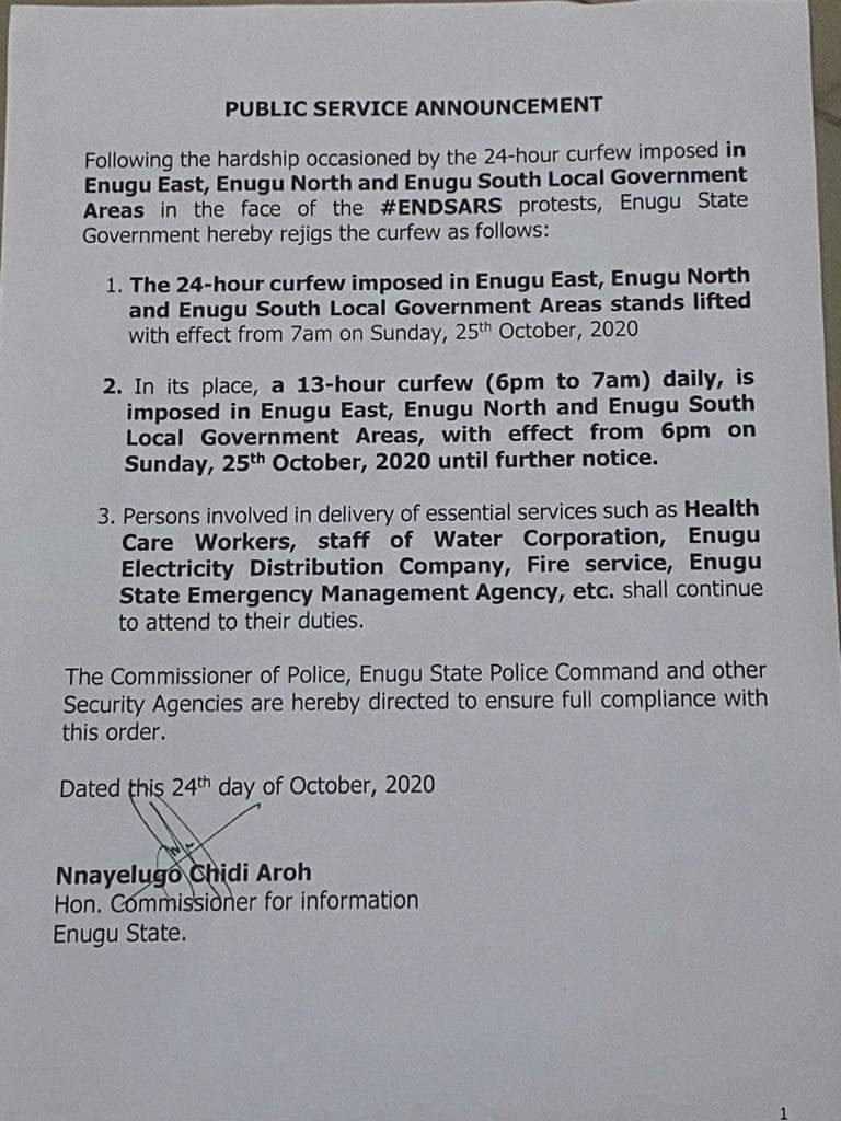 1. The 24-hour curfew imposed in Enugu East, Enugu North and Enugu South Local Government Areas stands lifted with effect from 7am on Sunday, 25thOctober, 2020.