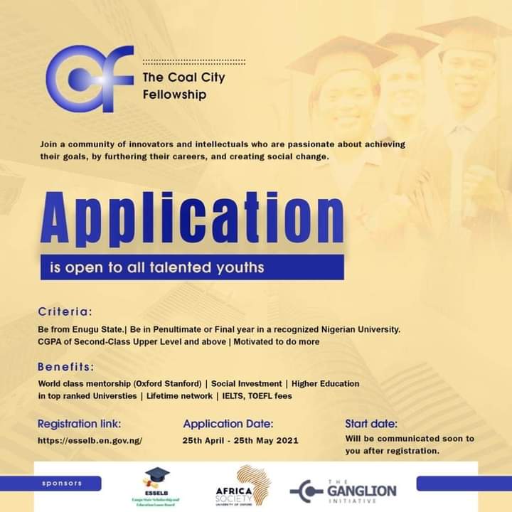 Announcing that the Fellowship application has commenced on Sunday, April 25, 2021, via: https://coalcityfellowship.esselb.en.gov.ng/login.php, to end on May 25, 2021, the statement advised indigenes of Enugu State in their penultimate year of undergraduate studies in a recognized Nigerian University, to utilize “this opportunity and apply to be part of this unique community of thought leaders, academics, and system innovators”.