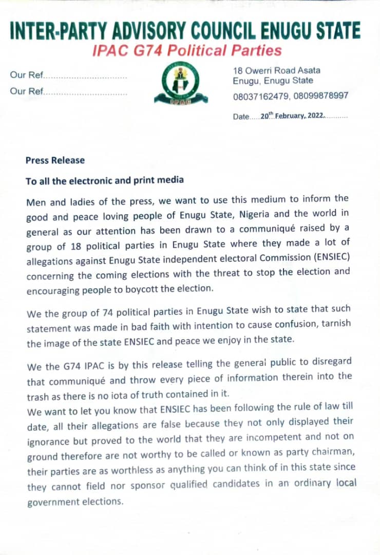 In a press release dated February 20, 2022, the IPAC G74, said the allegations made against the Enugu state Independent Electoral Commission, ENSIEC by the 17 political parties are false and should be disregarded. The 17 political parties had accused ENSIEC of flagrant violation of the election guidelines and called for boycott of the February 23 scheduled election.