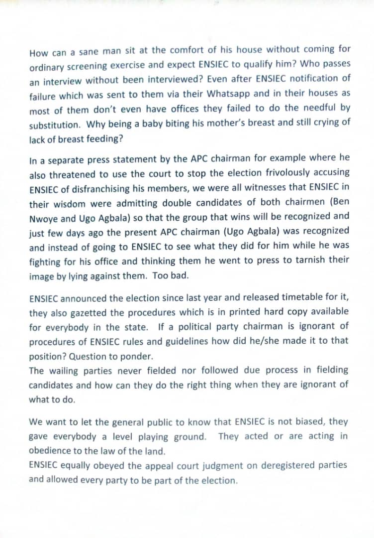“We want to let you know that ENSIEC has been following the rule of law till date, all their allegations are false because they not only display their ignorance but proved to the world that they are incompetent and not on ground therefore and not worthy to be called or known as party chairman, their parties are as worthless as anything you can think of in this state since they can not field nor sponsor qualified candidates in an ordinary local government elections.”