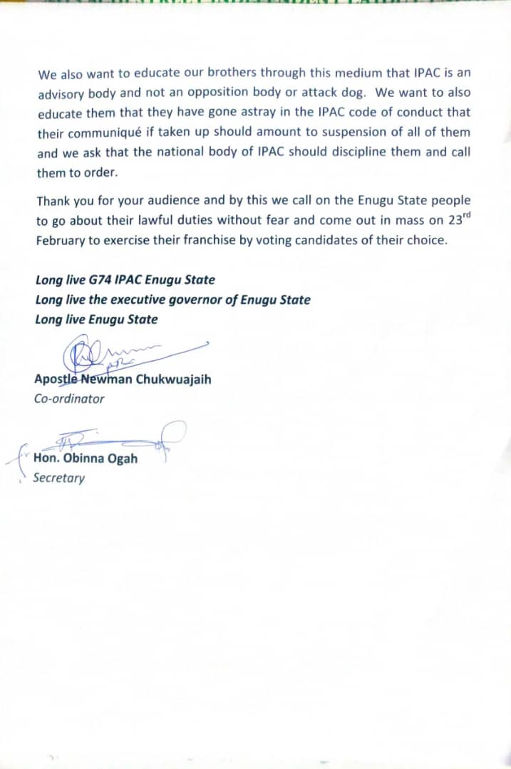 G74 said they want the general public to know, “that ENSIEC is not biased, they gave everybody a level playing ground. ” It stated that IPAC is an advisory body and not an opposition or attack dog. “We want to also educate them that they have gone astray in IPAC code of conduct that their communique if taken up should amount to suspension of all of them”, and called on the national leadership of IPAC to “discipline and call them to order.”