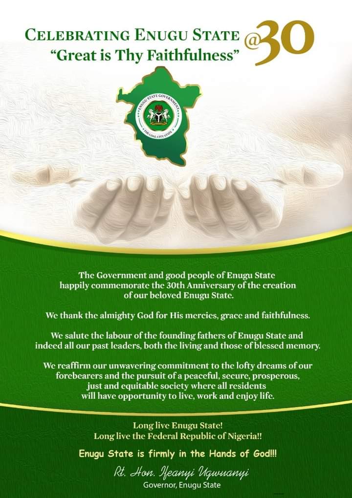 In commemoration of the 30th anniversary of the creation of #Enugu State, #Governor Ifeanyi #Ugwuanyi, in a message on Friday, tagged: “Great is Thy Faithfulness”, on behalf of the government and good people of the state, thanked the Almighty God for His mercies, grace and faithfulness.