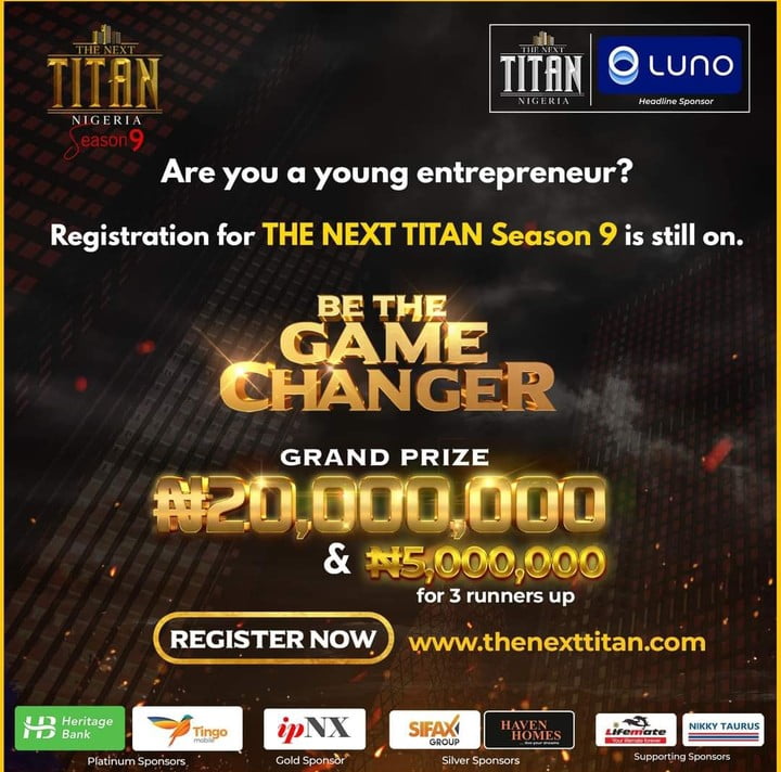 The Next Titan reality show is arguably one if the best entrepreneur tv reality show with it’s Season 9 registration currently ongoing where the winner will go home with ₦20M and the runner up with go home with ₦5M.
