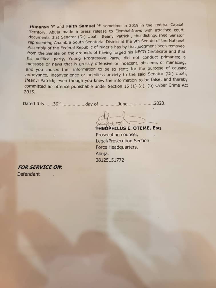 “That you Eziafa Samuel Enwedo (M) and the following other persons now at large that is Anani Anacletus Chuka(M),Aron Ifunanya (F), Faith Samuel (F) and Obinna Uzor (M) sometime in ,2019 at the Federal Capital Territory Abuja; made a press release to Elombanews with attached court documents that Senator (Dr) Ubah Ifeanyi Patrick, the distinguished Senator representing Anambra South Senatorial District at the 9th Senate of the National Assembly Of the Federal Republic Of Nigeria has by that Judgment been removed from the Senate on the grounds of having Forged his NECO Certificate and that his party, Young People’s Party (YPP( did not conduct primaries, a message or news that is grossly offensive or indecent, obscene or menacing, and you caused annoyance, inconvenience or needless anxiety to the said Senator (Dr) Ubah Ifeanyi Patrick, even though you knew the information to be false, and thereby committed an offence punishable under Section 15(1)(a),(b) Cyber Crime Act 2015”.