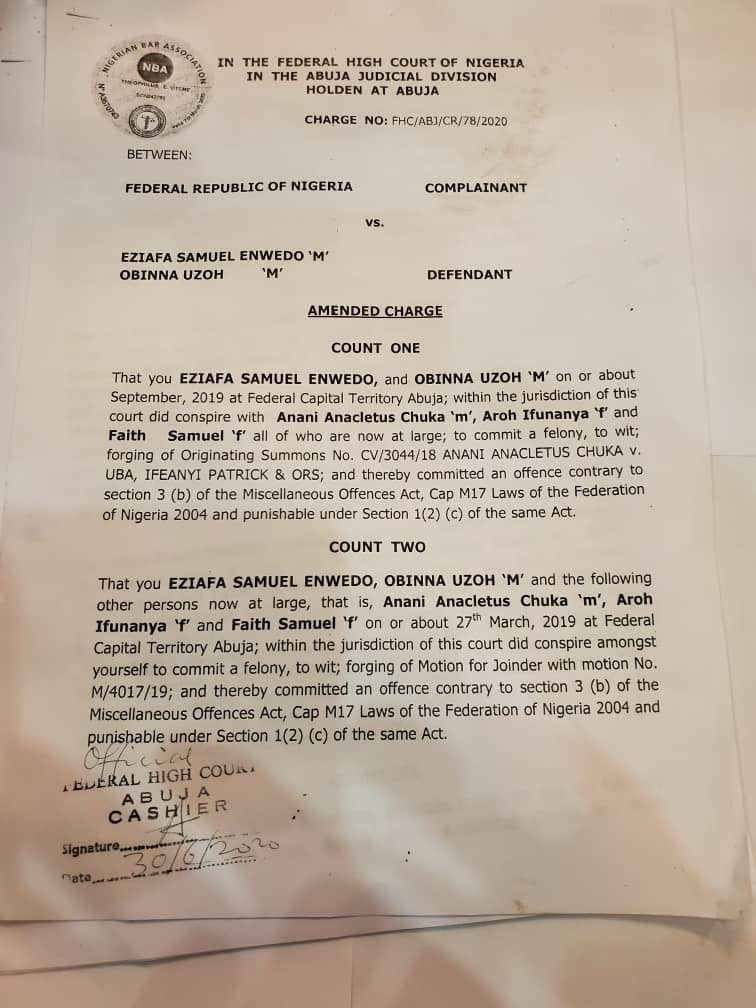 Meantime, some of the charges FG slammed on the Defendants on Wednesday, read: “That you Eziafa Samuel Enwedo on or about September, 2019 at the Federal Capital Territory within the jurisdiction of this court did conspire with Anani Anacletus Chuka, Aron Ifunanya, Faith Samuel and Obinna Uzor all of who are at large to commit a felony to with forging originating summons number CV/3044/18 Anani Anacletus Chuka Versus Ubah Ifeanyi Patrick and Others and thereby committed an offence contrary to Section 3(b) of the miscellaneous offences Act Cap M17 Law’s Of the Federation Of Nigeria 2004 and punishable under Section 1(2) of the same Act.