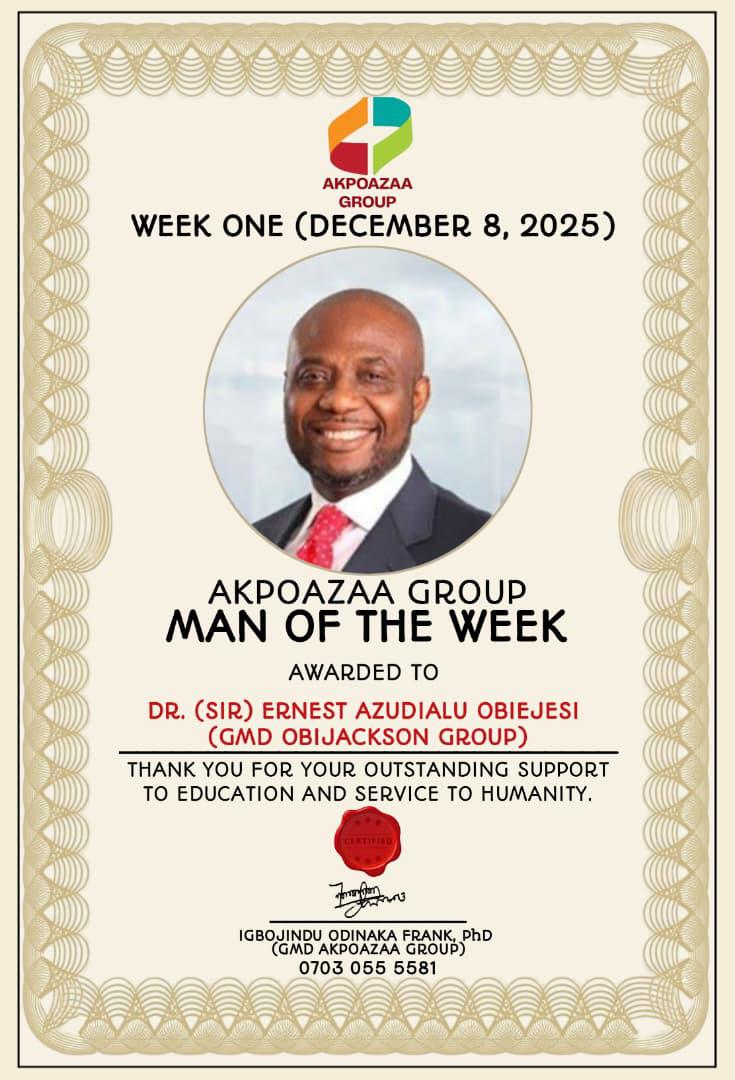 Today, we proudly unveil the Pioneer Recipient of the prestigious Akpoazaa Group MAN OF THE WEEK Recognition Award: Dr. (Sir) Ernest Azudialu Obiejesi (Group Managing Director, Obijackson Group)