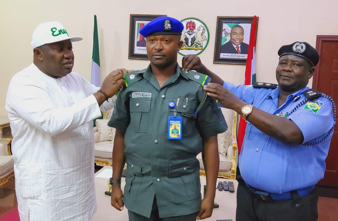 Governor Ifeanyi Ugwuanyi of Enugu State, on Thursday, decorated his Aide-de-camp (ADC), Peter Nnadozie, following his promotion to the rank of Superintendent of Police (SP) by the Police Service Commission (PSC) as recommended by the Inspector-General of Police, IGP Alkali Baba Usman.